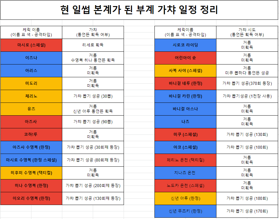 우측 표는 애정 케릭이 아니면 거를 것도 많고 시기가 여유롭지만 좌측 표는 필수 케릭이 연달아 나오고 한국 서버는 일정을 앞당기고 서버가 터지지 않아서 재화가 훨씬 부족한 상황입니다